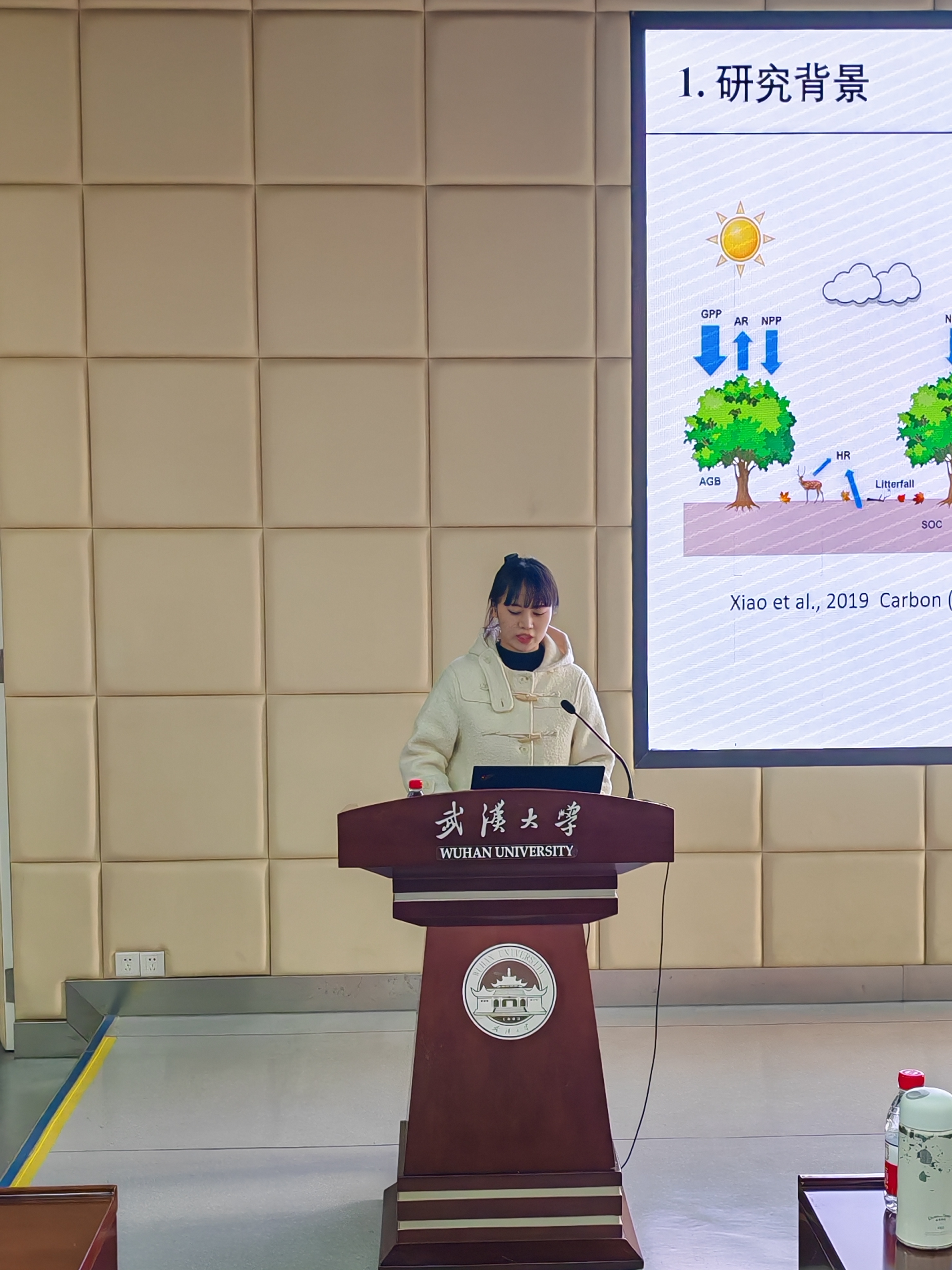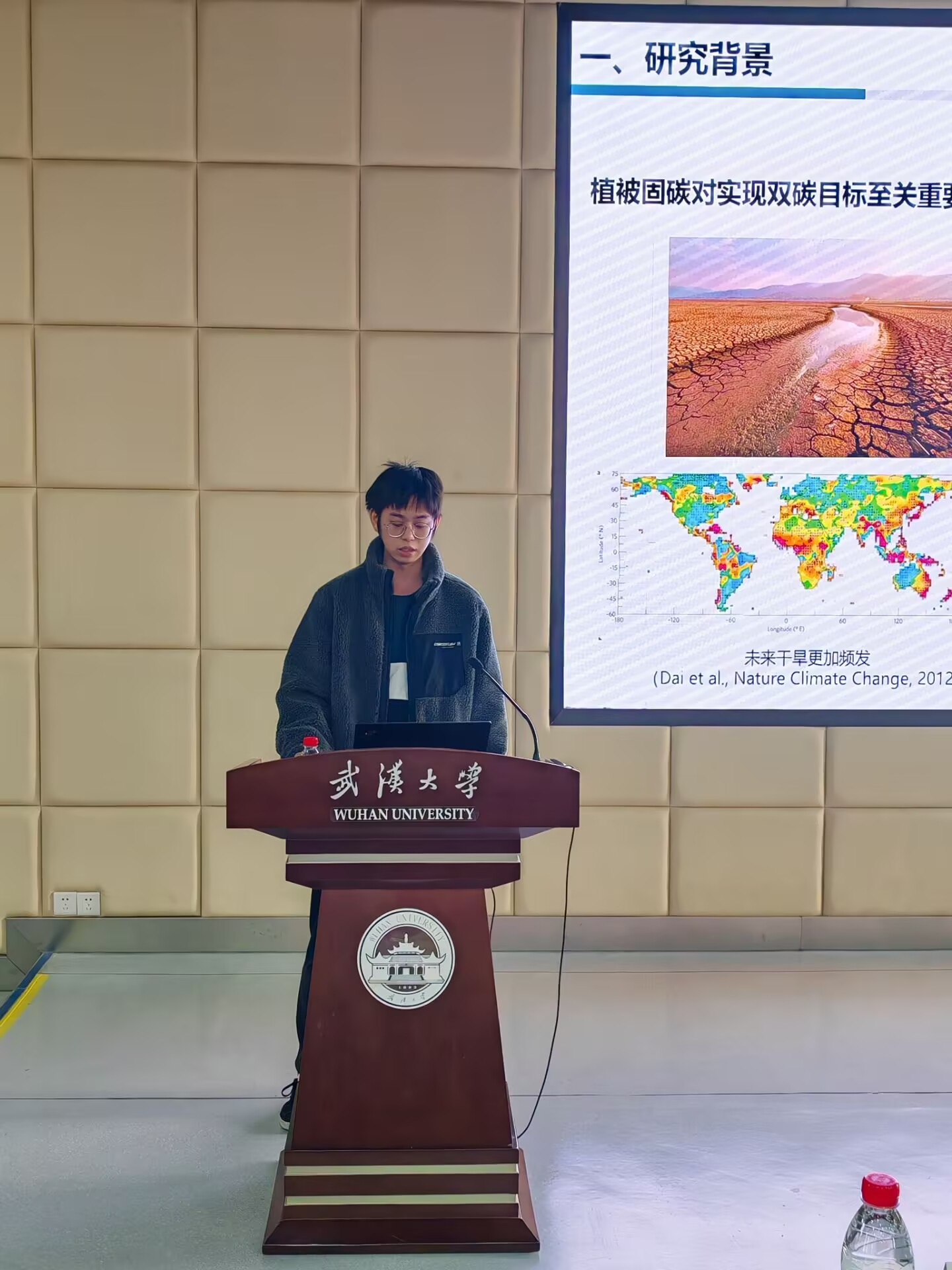 随后,魏毅恒同学以《干旱对中国植被总初级生产力敏感性的影响与评估》为题进行学术报告。首先针对干旱频发影响碳循环、干旱对植被的影响机制复杂且尚不明确以及过往研究难以表达植被-环境交互作用的问题,魏毅恒同学提出了“植被生产力对干旱事件的响应机制”这一科学问题。随后,他介绍了研究利用的Noah-MP陆面模式和结构方程模型,并通过分析植被GPP与其他生态系统变量之间的敏感性和水文气象变量的敏感性变化,评估了代表性干旱事件对GPP的损失影响。魏毅恒同学的研究结果能够反映干旱期间生态系统的变化,并加深入们对干旱对生态系统物理和生物化学过程影响的理解。
