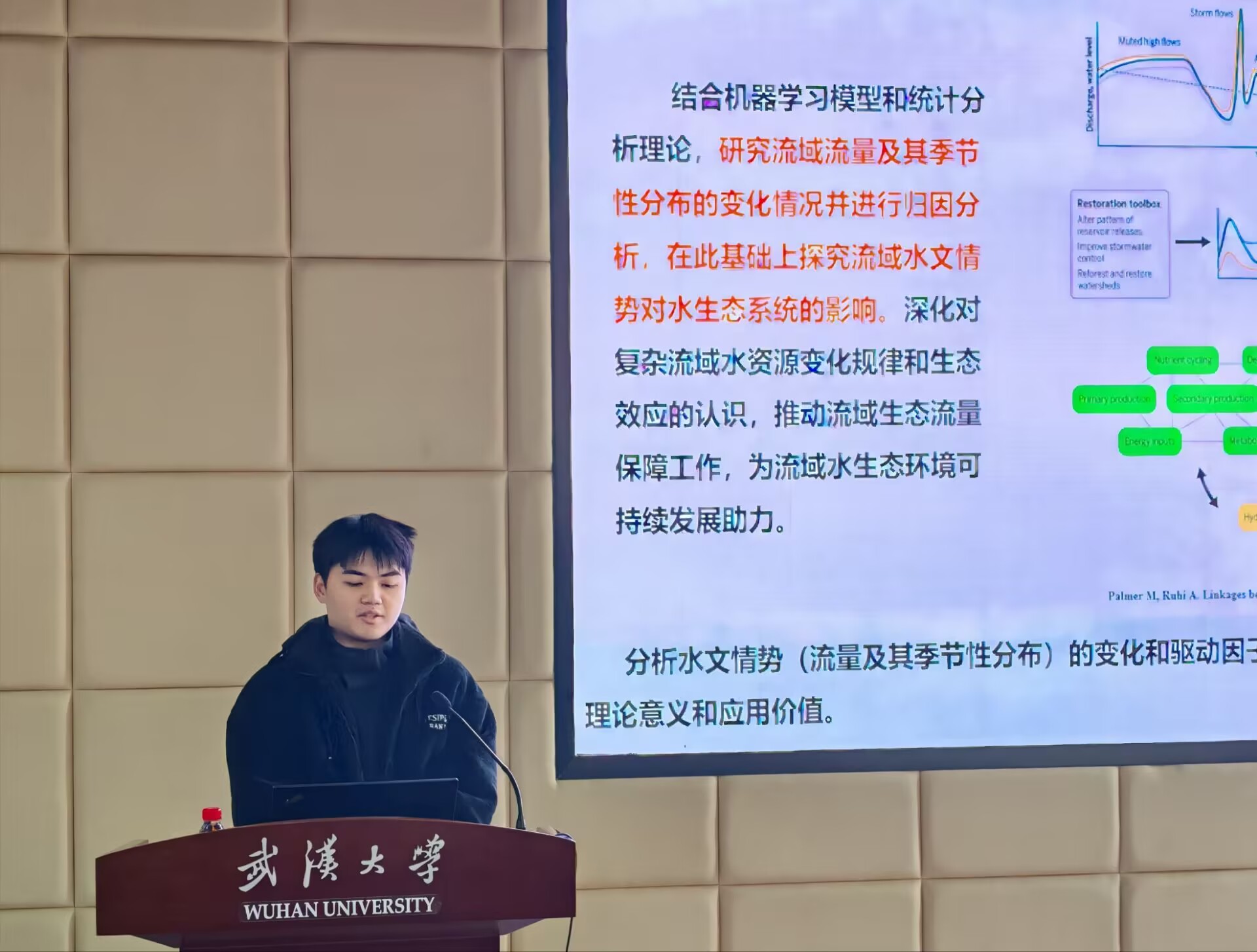 首先,黄一凡同学以《基于机器学习的汉江流域水文模拟及水文生态效应研究》为题进行学术报告。目前由于气候变化和人类活动的共同影响,汉江流域水文情势出现了“非自然化”趋势,对生态系统平衡和可持续发展带来了严峻挑战。基于此背景,黄一凡同学提出构建一种结合机器学习模型与物理方程的数据驱动方法,并从基于机器学习模型的汉江流域径流模拟、汉江流域储水能力变化、归因分析、流域季节性特征识别与水文-生态关系建立三个方面详细介绍了自己的研究成果。他指出,该研究深入探究了水文情势对水生态系统的影响,具有十分重要的理论意义和应用价值。