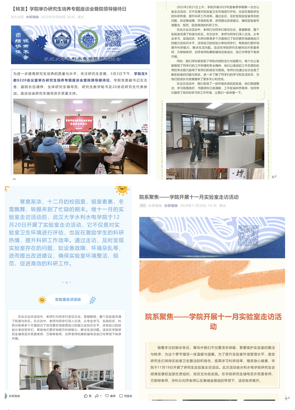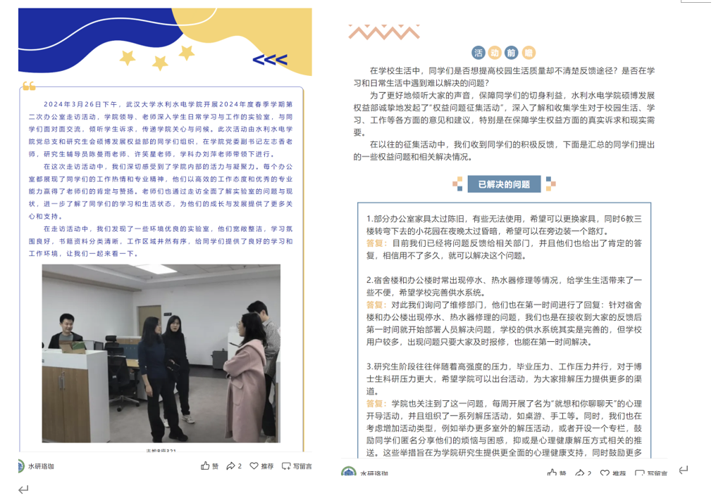 收集并解决权益问题 128项。 向院内同学发送权益通知80余条 转发校领导接待学生日活动、职能部门与学生面对面活动及与同学们 生活权益相关的调研会、座谈会信息9余次 向校研究生会反馈权益问题11次 |