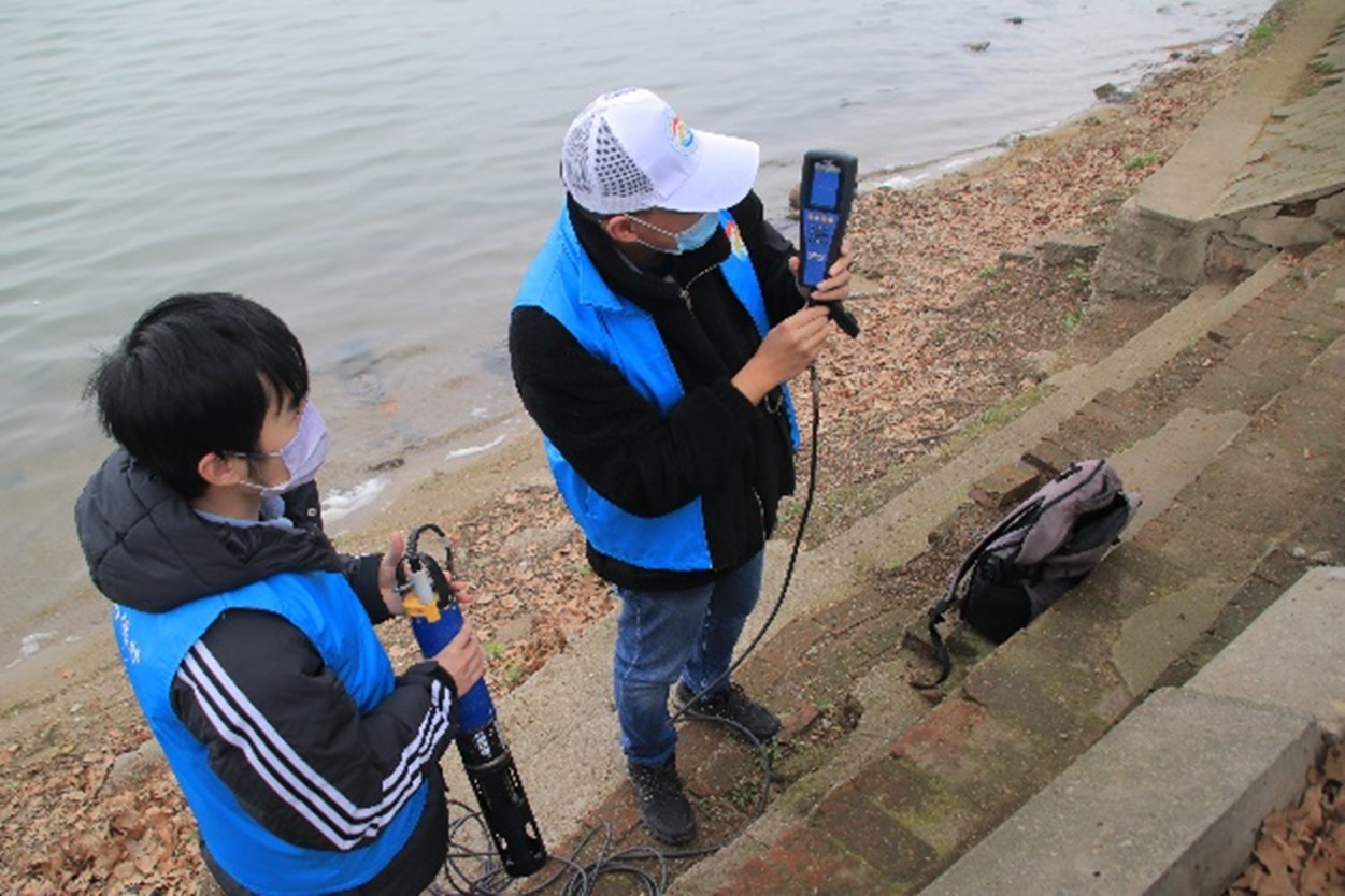 随后,志愿者们携带水质测量专业仪器前往凌波门附近开展水质测量工作。来自水文二团支部的研究生志愿者现场为大家讲解测量仪器的使用方法和注意事项,关注水温、溶解氧、pH值等指标,强调均匀采样、多点分布,并做现场演示,帮助志愿者掌握水质测定的方法。