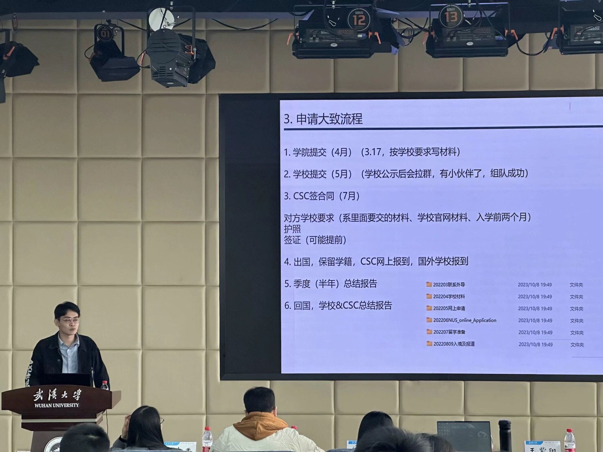 黄绳同学向大家着重介绍了CSC申请的基础信息和大致流程以及留学国家、学校及导师的选择。首先是CSC的基本情况,包括如何在基础信息网站找到与出国留学相关的信息。他介绍了2023年国家建设高水平大学公派研究生项目,包括报名时间、选拔范围以及基本要求和限制等,同时他也根据申请流程详细分享了申请细节,包括申请的时间安排、邀请信和导师CV书写、以及外方导师最多可招收人数等。接着,黄绳同学结合自身经历介绍了CSC留学国家、学校及导师选择方面的经验,并对自己所在的课题组以及外导进行了介绍。最后,黄绳同学分享了自己在国外的学术和科研生活,学术方面包括组会的频率、图书馆的时间规定、课程和讲座的丰富程度等等,生活方面介绍了自己是如何融入当地生活的,以及自己的爱好和旅游经历…