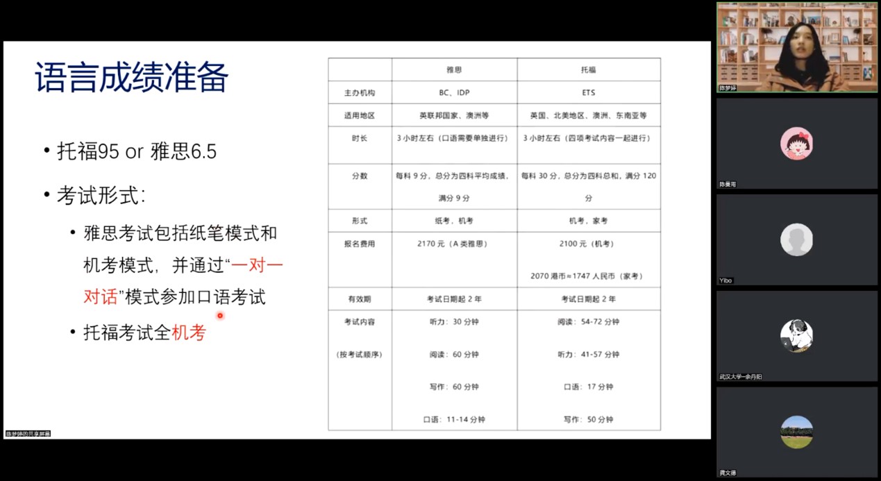 陈梦婷这一年里在以色列理工学院进行交流,此次交流会她着重介绍了留学英语的准备、留学的申请以及以色列介绍。首先她从考试形式、阅读、写作、口语等方面向大家详细地说明了托福和雅思的差异,之后介绍了该如何备考。留学申请方面,她为大家介绍了研究计划的确定。之后介绍了她留学所在的国家以色列。