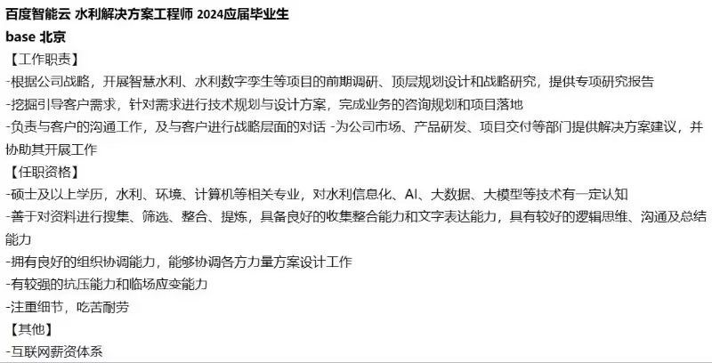 百度智能云希望招一个水利的应届硕士毕业生,岗位如下,有意愿的同学请联系水利行业解决方案负责人 宋子亨 15827037100