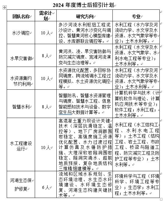 围绕黄河流域生态保护和高质量发展重大国家战略需求,从智慧水利、水旱灾害防御、水沙调控、水资源集约节约利用、河湖生态保护修复、水工程建设运行等六个方向组建创新研究团队,努力培养一批核心技术骨干,产出一批高水平科技成果。围绕各个创新团队,黄河设计院2024年度博士后招引计划如下。