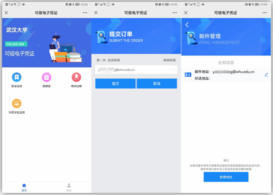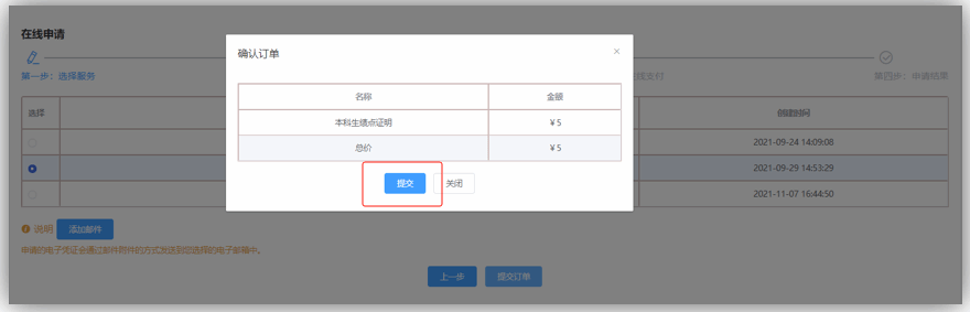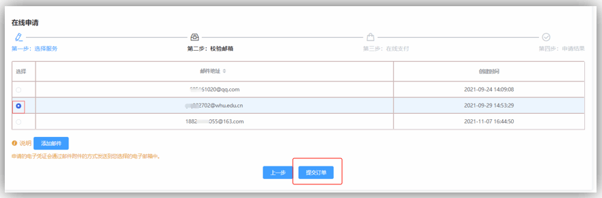 选择需要发送的邮箱地址,核对邮箱地址,无误则点击“提交订单”进入下一步操作,不对返回邮箱管理,修改为正确邮箱再重新申请。
