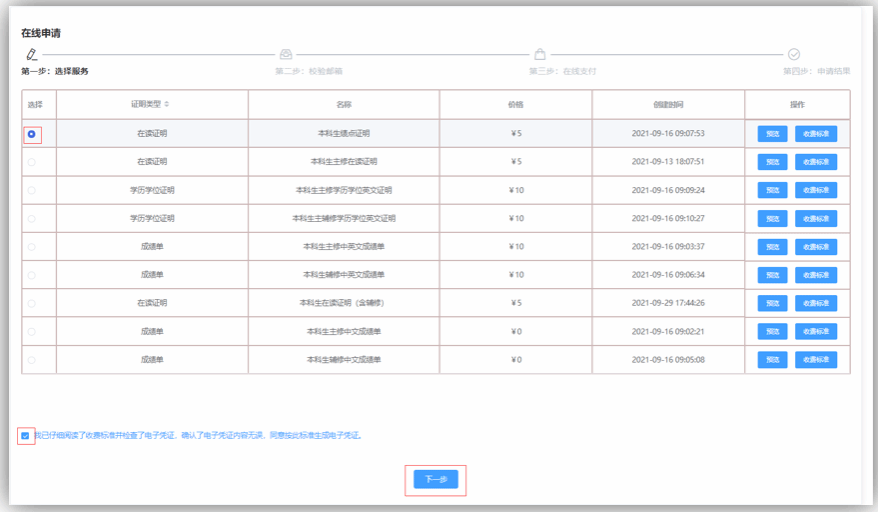 可以申请学生电子凭证业务,点击在线申请进入选择服务,根据自身需要选择不同的凭证类型,预览凭证打印结果,确认无误后,点击同意用户协议,进入下一步。(根据校友身份信息,所显示的服务类型会有所不同)
