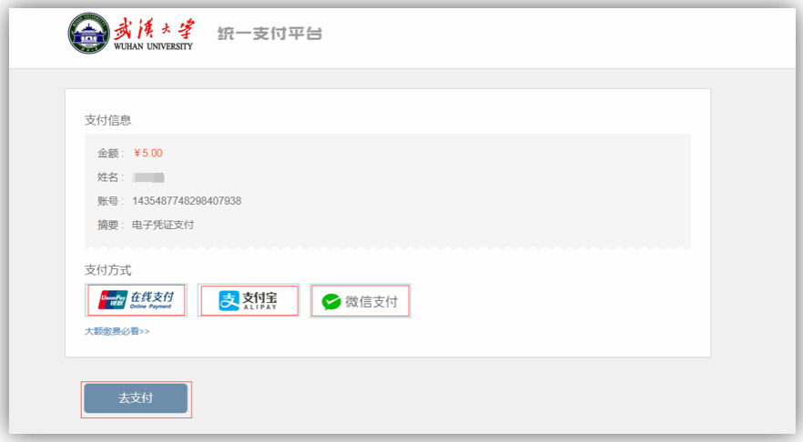 确认邮箱后,进入在线支付环节,根据后台管理端设置的收费标准,选择支付方式,确认支付。