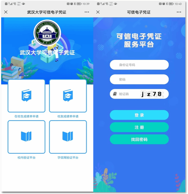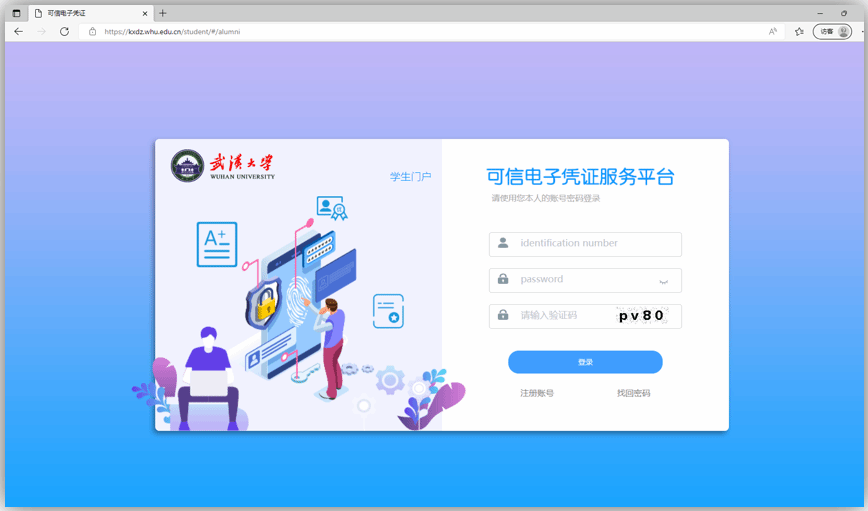 可信电子凭证平台。点击“校友成绩单申请”,进入校友登录界面。首次使用,请点击“注册”进行账号注册。注册流程请根据系统引导完成。