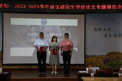 首先伍靖伟副院长宣读表彰文件。研究生程亦菲、李旭东、贾晓琳获得“最佳学位论文奖”,夏军强老师、杨威嘉老师、付湘老师获得“优秀指导教师”称号。伍靖伟老师分别为他们颁奖。