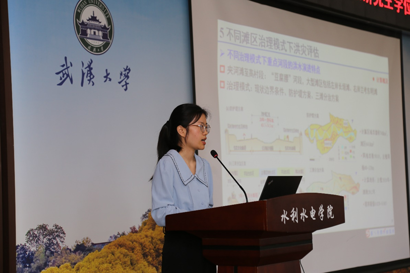 然后第一位汇报人是优秀博士学位论文获得者程亦菲,汇报题目为《黄河下游河道排洪输沙规律分析与滩区洪水风险评估》。程亦菲详细介绍了论文的主体内容,包括研究背景、河道水沙运动特点、河道排洪输沙规律、排洪输沙过程与风险评估模型和不同滩区治理模式下洪灾评估。最后程亦菲分享了撰写学位论文的一些经验,她建议大家一步一脚印,方能有条不紊,制定合理的研究计划表,安排各章节内容完成时间并按时完成;一字一斟酌,力争凸显创新,在论文大体内容完成后,多与老师交流,明确并凝练创新点;时时勤回首,把握各种细节,已完成的内容要早点撰写成文,并且打印出来反复修改。