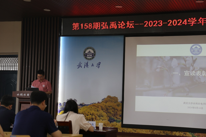 最佳研究生学位论文颁奖仪式暨第158期弘禹论坛专题报告会成功举办。出席本次活动的有院党委副书记左志香老师、副院长伍靖伟教授、副院长夏军强教授、副院长马刚教授、水利工程系党支部书记查元源副教授、河流工程主任杨中华教授、水力发电工程系副主任程勇刚副教授、水文水资源系付湘教授,研究生教学秘书、研究生辅导员。2025届毕业生参与活动,会议由余懿凡同学主持。