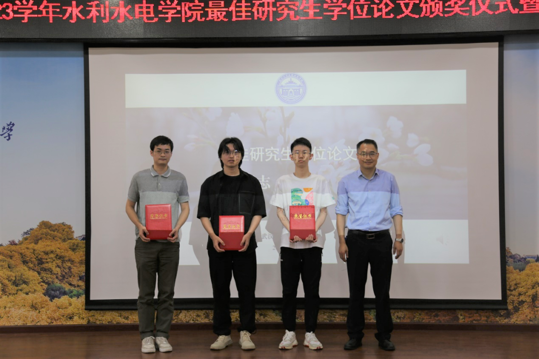 伍靖伟老师宣读表彰文件。研究生钱颖志、南天一、王珂获得最佳学位论文奖,黄介生、朱焱、陈杰和苏凯获得优秀指导教师称号。熊立华老师为他们颁奖。