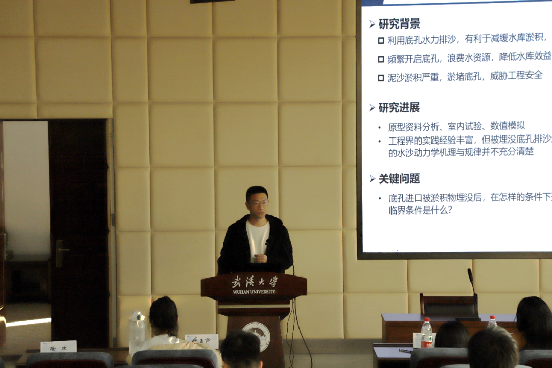 最后,徐欢同学以《引导水库被埋没底孔排沙的试验研究》为题进行学术报告,他指出,水库坝前泥沙淤积过深会威胁工程安全,但频繁开闸排沙将降低工程效益。坝前埋没底孔开闸排沙的水沙动力学过程与机制研究对水库排沙调度优化具有重要意义。为此,徐欢同学采用水槽概化试验,对比了不同底孔纵断面形式、不同泥沙类型和不同试验工况下水闸能否冲开排沙,分析了影响排沙的因素,并基于量纲分析和试验观测数据,提出了底孔冲开排沙的临界条件以及平衡条件下坝前冲刷漏斗形态模式,为后续数值模拟研究的开展和水库排沙调度优化提供了参考。