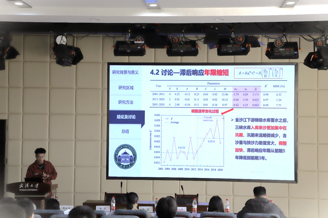 首先,李昕同学以《梯级水库蓄水对三峡水库泥沙淤积滞后响应规律的影响》为题进行学术报告。李昕同学指出,滞后性是河流系统自动调整的重要特征之一,当前对三峡水库泥沙累积淤积过程滞后响应的研究缺乏定量分析。以此为背景,李昕同学基于水流挟沙力机理构建了泥沙淤积滞后响应模型,并以三峡水库和金沙江下游梯级水库为研究区域,分析了梯级水库蓄水对三峡水库滞后响应规律的影响。研究发现金沙江下游梯级水库蓄水后,三峡水库来沙更加集中在汛期,同时水沙波动范围降低,滞后响应年限从前期5年缩短到前期3年,入库泥沙对库区泥沙淤积的影响增大,而流量对库区泥沙淤积的影响减小。这一研究成果为更好地理解三峡库区泥沙淤积的内在规律及对水库长期利用优化提供了参考。