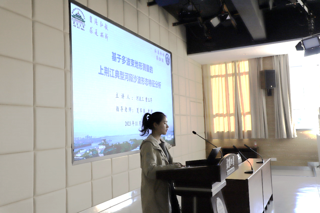 接着,曹玉芹同学以《坝下游水沙输移与河床演变规律》为题进行学术报告。曹玉芹同学首先引入了沙波这一概念,指出沙波形态的定量分析对推移质输沙能力、河道动床阻力等研究有着重要意义,而当前对沙波参数的研究并不能客观的反映整体沙波特点。以此为背景,曹玉芹同学采用多波束测深系统,精细测量了荆江局部河段不同流量下5个测次的床面地形,改进已有沙波形态特征参数的量化方法,提取并统计不同流量级下的波高、波长、背流面坡度等各类沙波形态参数,进而分析其统计特性及相关关系,探究了不同水流强度下沙波形态的变化特点。该成果能为天然大型冲积河流床面沙波形态的量化及特征参数的统计分析提供一定参考,从而为河道阻力及泄流能力变化提供研究思路。