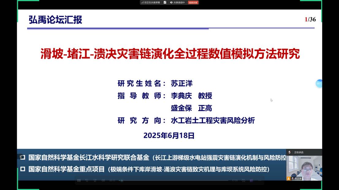 第三位是优秀博士学位论文获得者苏正洋,汇报题目是《滑坡-堵江-溃决灾害链演化全过程数值模拟方法研究》。针对我国高坝面对水位骤变等极端条件易造成滑坡堵江等灾害,苏正洋建立了水力驱动条件下库区滑坡灾害链启动数值模型,提出了考虑块石空间分布特征的边坡高保真建模方法,并研发了滑坡-堵江-溃决灾害链全过程数值模拟技术。在最后他分享了自己的论文写作经验,他提出撰写学位论文,选题是重中之重,建议结合导师项目,选择前沿方向,并紧密贴合工程实际;写作时,要摒弃内容堆砌,注重逻辑架构,讲好一个故事远比讲长故事更关键;同时,要积极向身边人请教,集思广益,让论文兼具深度与创新性。