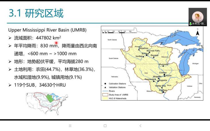 最后,博士生陈曼雨作了题为《SWAT模型在大型流域的模拟与应用》的报告。SWAT模型是一个基于物理过程的水文模型。该模型可以用于模拟地表水和地下水的水质和水量,长期预测土地管理措施对具有多种土壤、土地利用和管理条件的大面积复杂流域的水文、泥沙和化学物质产量的影响。本汇报旨在介绍SWAT模型的特点及其在大型流域的应用现状及局限。