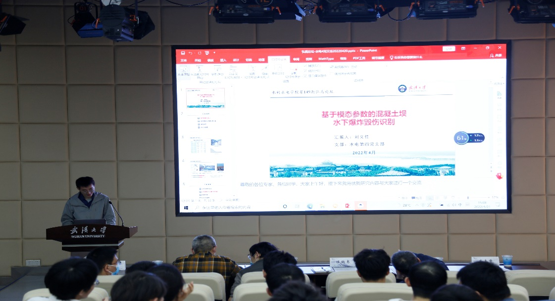 随后,刘义佳同学以《混凝土坝水下爆炸毁伤识别方法》为题进行学术报告。刘义佳同学指出大坝具有显著的政治经济效益及战略地位,成为恐怖袭击和局部战争中的重点打击目标。在水下爆炸冲击荷载作用下,大坝可能会出现爆炸成坑、坝体开裂、震塌滑移等不同的破坏形式,实现大坝水下爆炸毁伤的快速准确识别对于坝体应急状态下的抢险救灾具有重要的指导意义。并在报告中提出了基于模态参数的混凝土大坝水下爆炸毁伤识别方法,利用贝叶斯概率考虑有限测量噪声,结合机器学习算法和高维采样技术实现了对重力坝和拱坝的毁伤部位、形态和空间分布特征的准确识别。