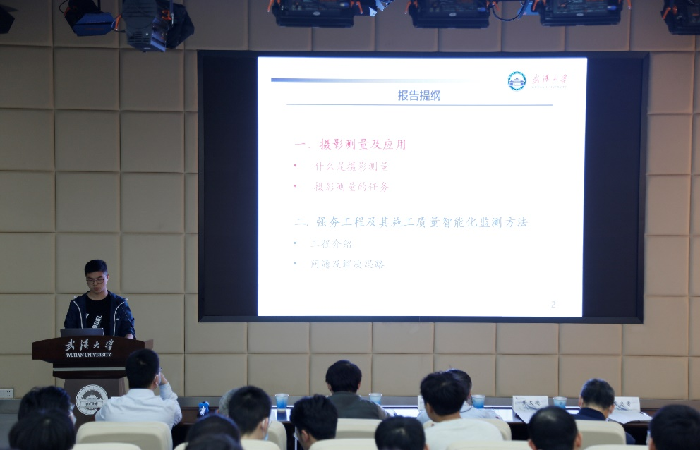 高乔裕同学以《单目视觉测量技术在工程领域的应用——以强夯夯沉量监测问题为例》为题进行学术报告。首先高乔裕同学介绍了报告研究背景:单目视觉测量技术具有非接触、结构简单、解算原理易理解、设备安装成本低等优点,已被广泛应用于机器人导航、无人机姿态解算、航天器交汇对接等多个领域。而在工程建设领域,以监测为主的许多任务依旧依靠人工完成,在增加了人力成本的同时,安全风险较高。因此,如何解决人工建设的弊端,实现工程建设数字化目标,提高工程管理的效率是目前研究的热点问题。随后以强夯工程中夯沉量的自动化监测为例,探讨单目视觉测量技术在工程中的应用问题。