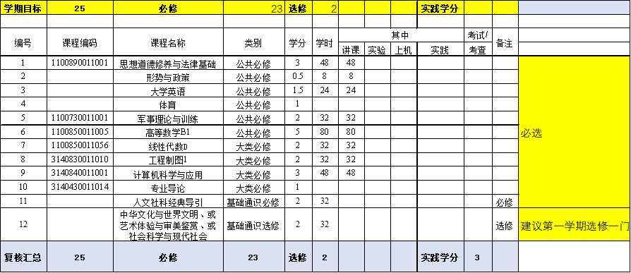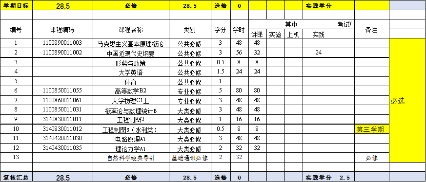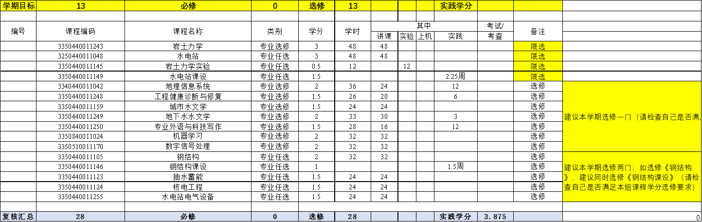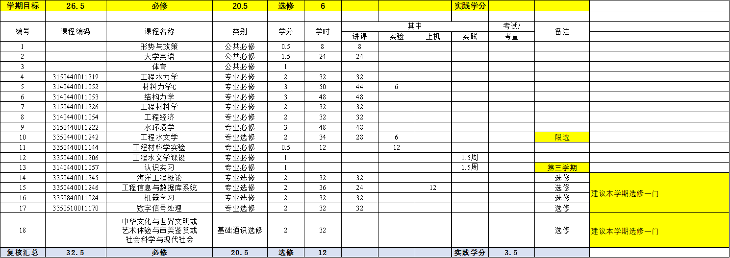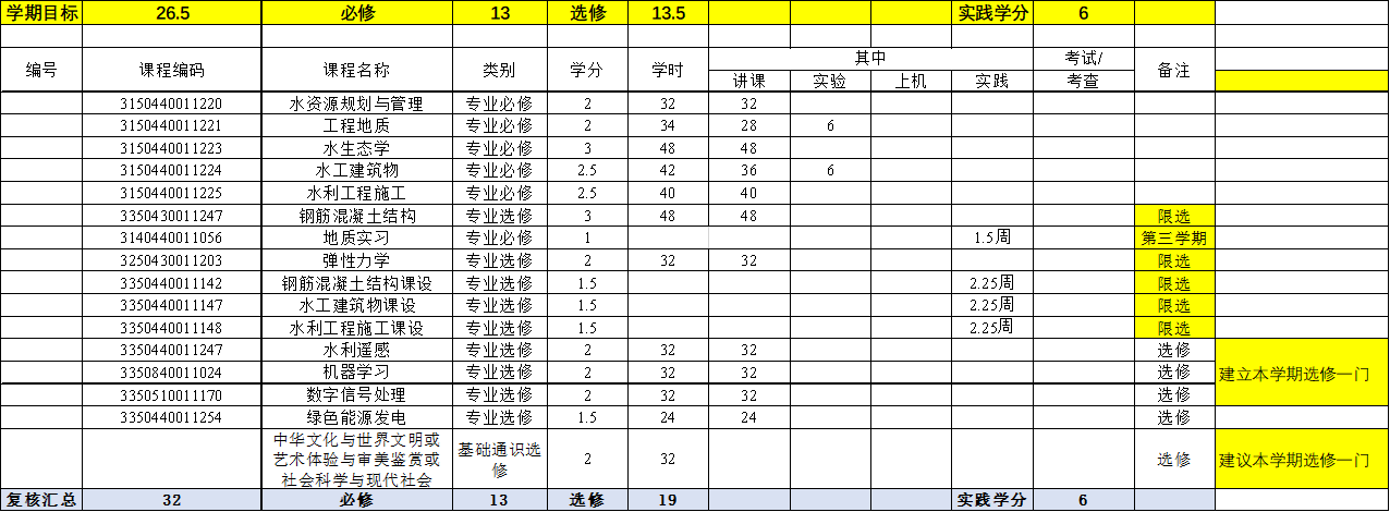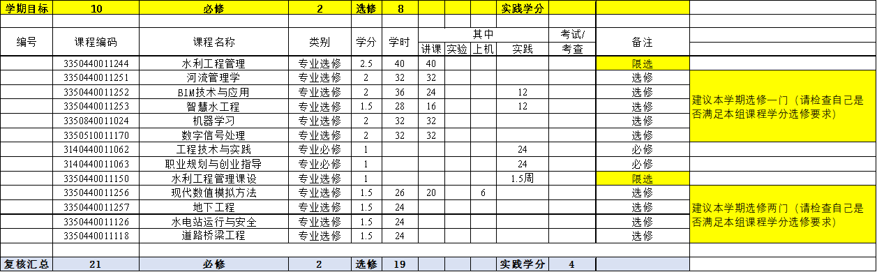 本专业的培养方案是按水利大类培养方案制定的,由于必修课程和选修课程比例的限制,部分工程教育认证标准中要求的课程被列入选修课或并入其它课程。为了保证对本专业所有学生相关基本专业能力培养不会带来不确定性,对本专业学生的选课做出了如下指导性意见: